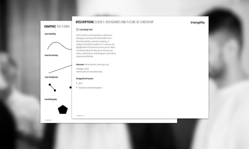Bei triangility gestalten wir diese Programme als Learning Journeys für Führungskräfte. Sie bestehen aus mehreren Etappen, in denen sich Lernen, Anwenden und Reflektieren abwechseln. Ob in Form von Workshops, selbstorganisiertem Lernen, Peer-Feedback oder begleiteten Praxisphasen: Entscheidend ist, dass neue Perspektiven im Arbeitsalltag ausprobiert werden – und zwar nicht nur einmal, sondern immer wieder.
